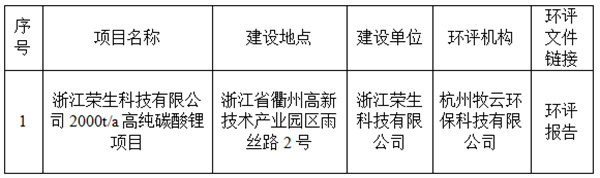 浙江荣生科技有限公司2000t/a高纯碳酸锂项目环境影响评价公示